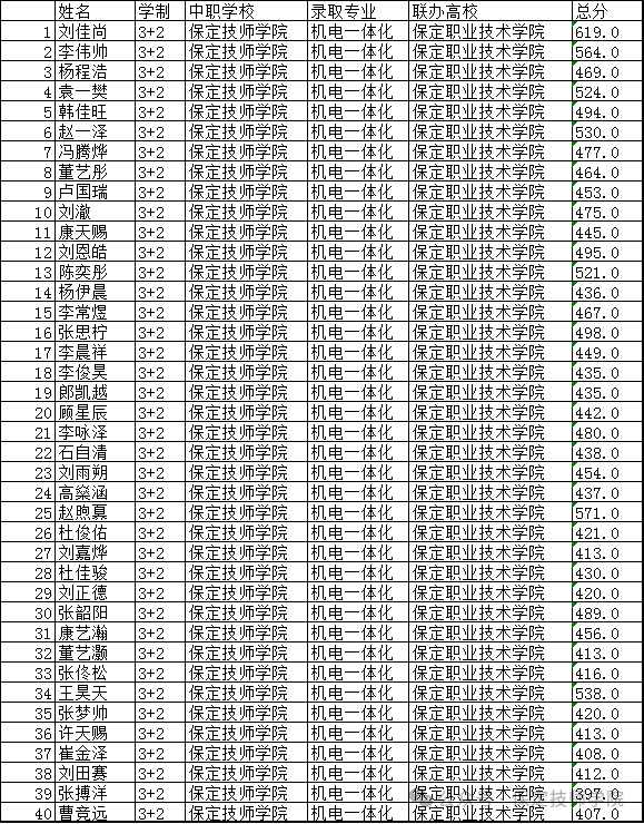 附:保定技师学院2025年中高职贯通录取培养“3+2”录取公示名单